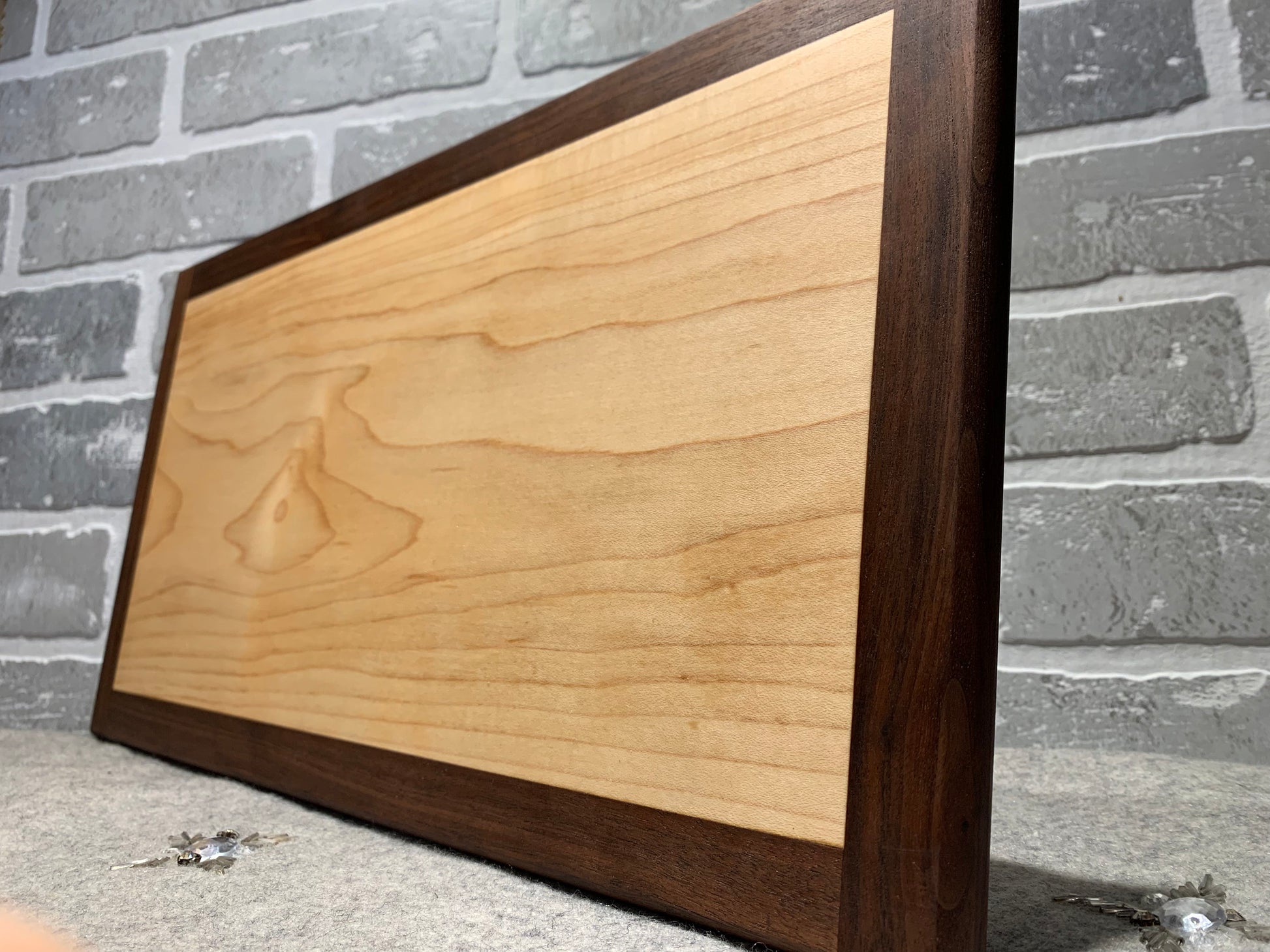 This charcuterie board measures 16.75in long x 9.25in wide x 0.75in thick. It is crafted out of a single piece of maple with an added walnut border. Since it is face-grain, it is not recommended to cut on. Can be personalized (FREE). Comes pre-seasoned with a tin of board butter, regular feet, and a board care sheet.